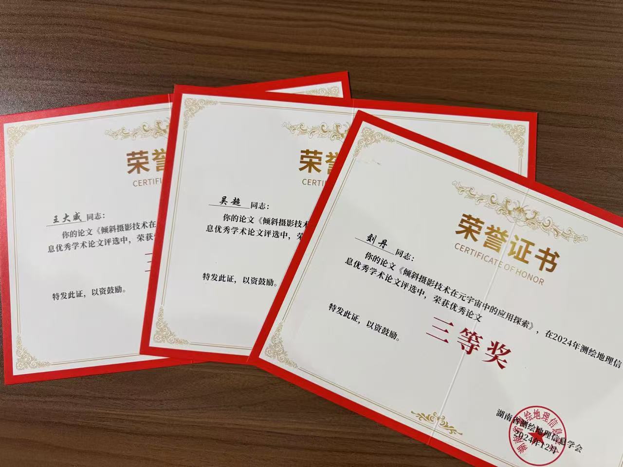 同時,在本次大會上還頒發了2024年測繪地理信息優秀學術論文獎,湖南超立方空間信息技術有限公司的王大威、吳超、劉丹三位優秀工作者,以論文《傾斜攝影技術在元宇宙中的應用探索》榮獲2024年測繪地理信息優秀學術論文三等獎。